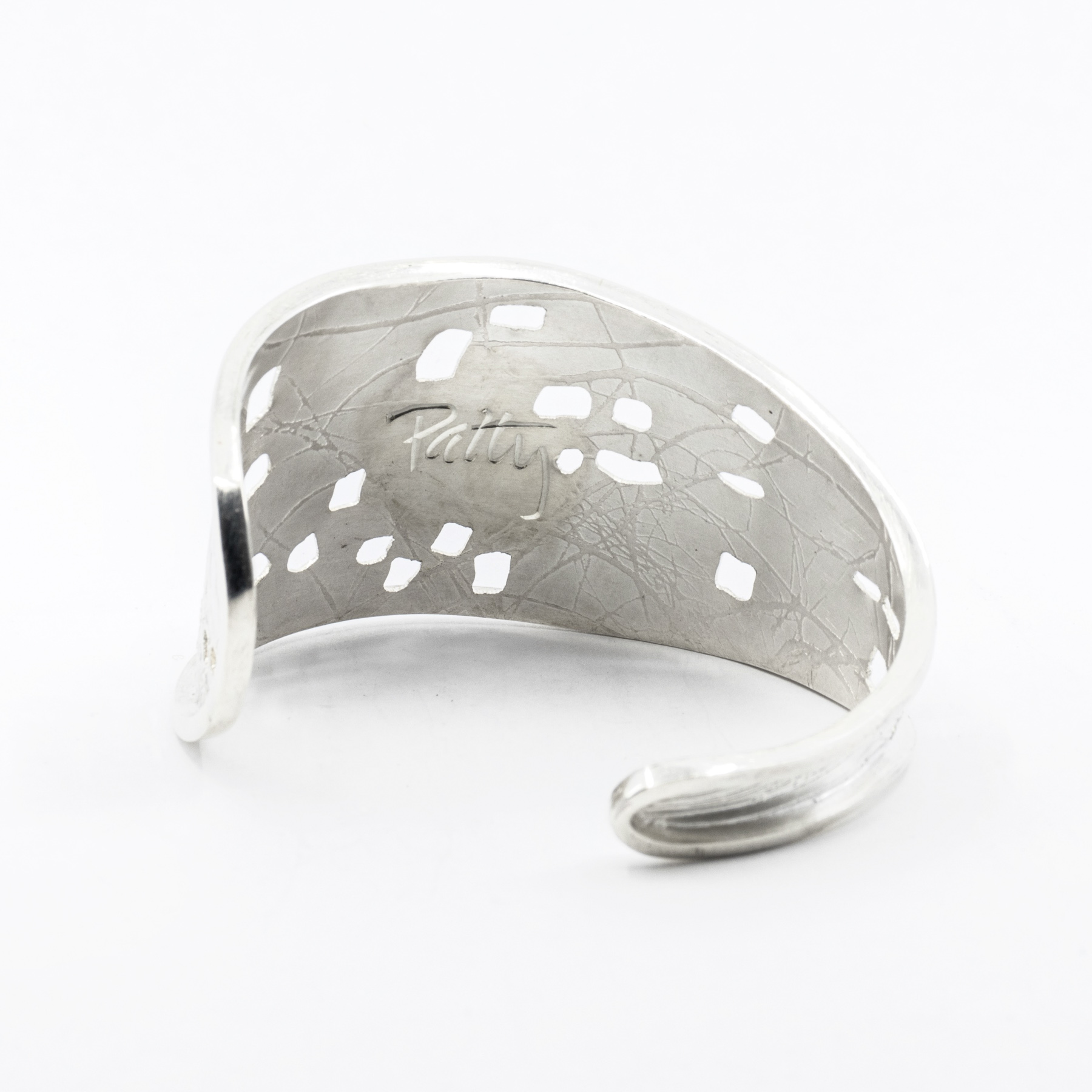 in sterling silverFramed asymmetric Wing motif with lace-like cut outs, in a bright shimmering luster. Interior has a smooth matte abstract motif with Patty signature etched at center.