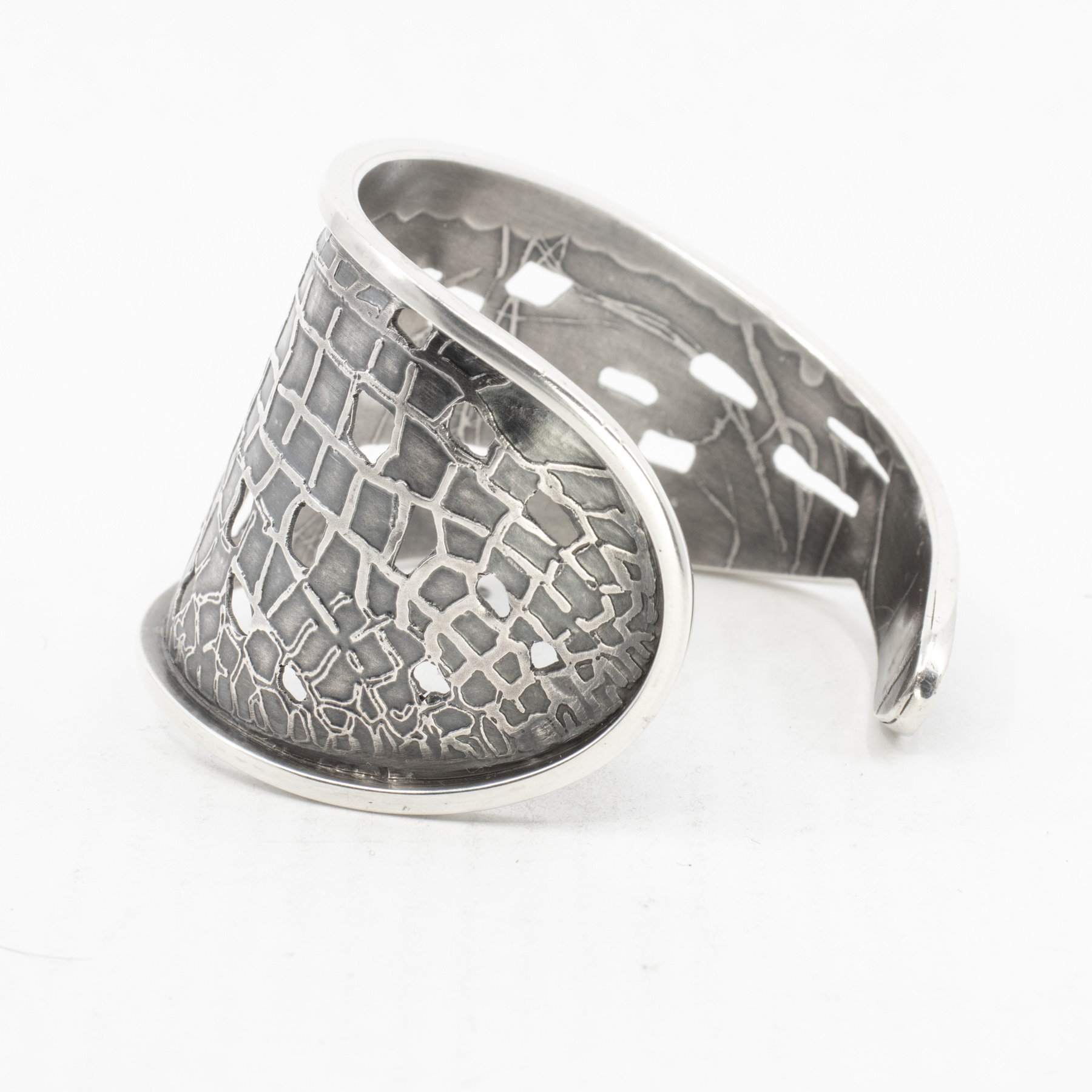 in sterling silverFramed and patinaed asymmetric Wing motif with lace-like cut outs. Interior has a smooth matte abstract motif with Patty signature etched at center.